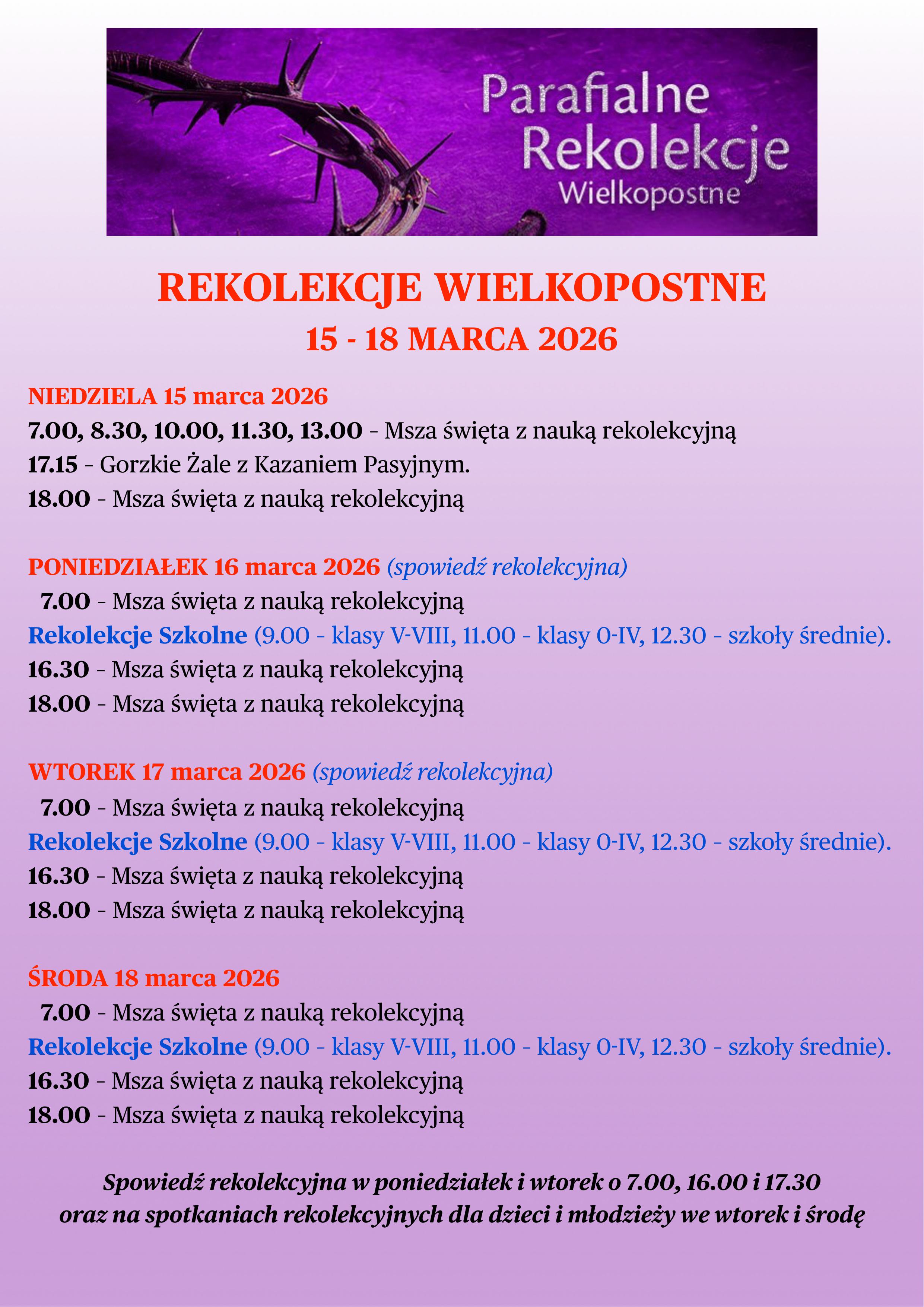 Wszystkich parafian oraz gości serdecznie zapraszamy na nadchodzące Rekolekcje Wielkopostne, które odbędą się w naszej parafii.