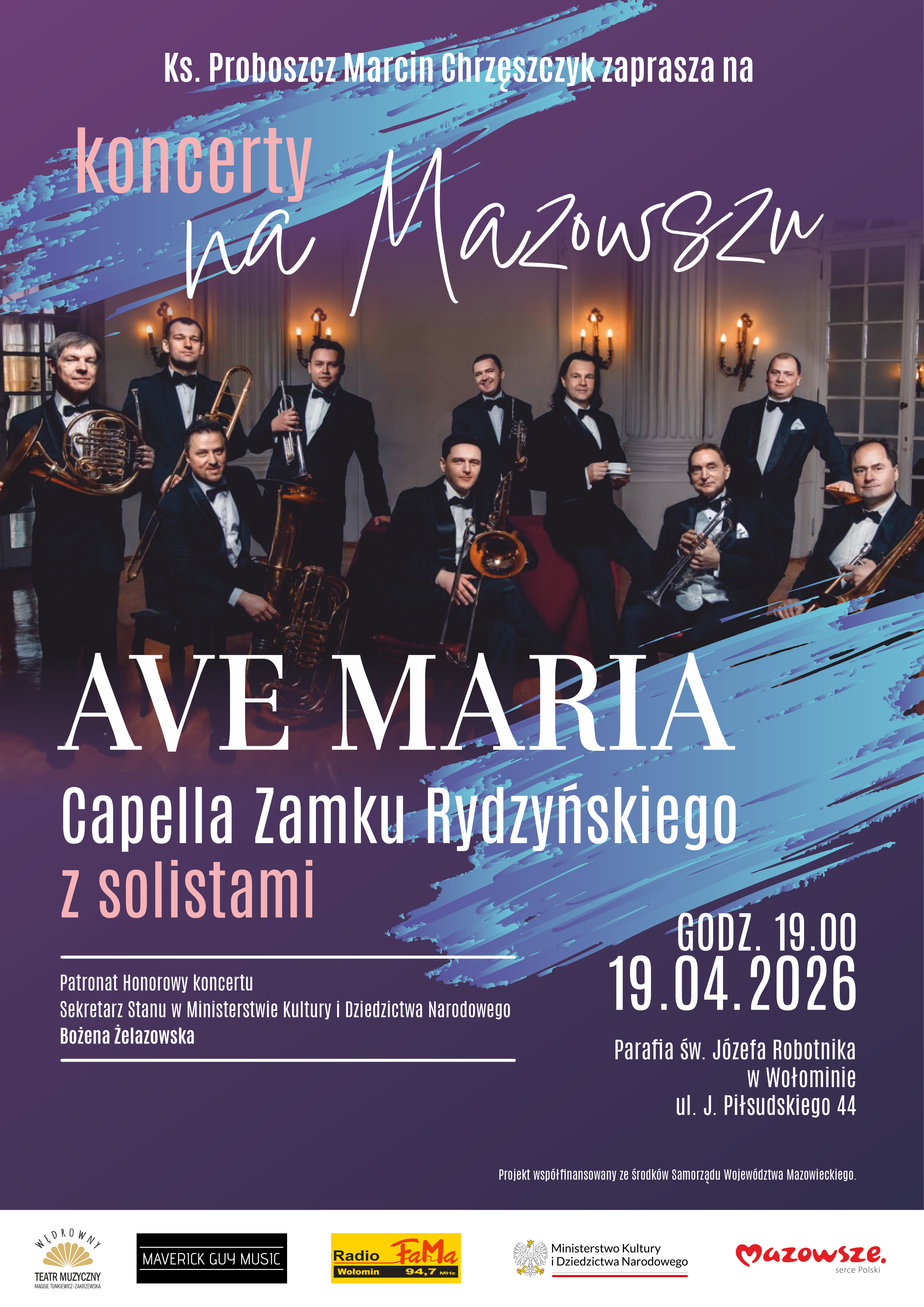 Proboszcz Parafii św. Józefa Robotnika w Wołominie Ks. Chrzęszczyk oraz Wędrowny Teatr Maggie Tunkiewicz-Zakrzewskiej zapraszają na „Koncert na Mazowszu – AVE MARIA”